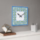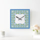 Eine hübsche, quadratische Wall-Uhr, mit einer Grenze von Morning Glory-Blume auf weißem Hintergrund. Teil der Posh & Painterly 'Morning Glory' Kollektion.