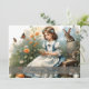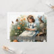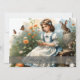 Ein junges Mädchen in einem blauen Kleid mit weißen Kruffeln sitzt auf einer Holzbank inmitten eines blühenden Gartens. Sie liest eine kleine Karte, während Schmetterlinge um sie fliegen. Ein Hasen und ein kleines Kaninchen sitzen neben ihr, während andere Frühlingsblumen in warmen Farben im Hintergrund blühen. Die Worte "Happy Oaster" geben dem Bild eine festliche Touch.