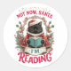 A fun and cheerful Christmas holiday design showcases a black cat dressed in a red cape and a white turtleneck sweater, engrossed in reading a book. The cat sits in front of fern and holly branches, under a golden arch adorned with bells. The colorful text reads, "Not now Santa, I'm reading." This design is available on various products that make perfect gifts for book lovers.