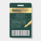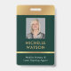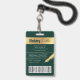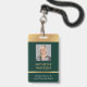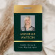 Modernes Foto-ID-Abzeichen in smaragdgrün und gold mit Platz für ein individuelles Profil Foto, Jobtitel, Kontaktdetails, Services und Barcode. Dieses elegante Abzeichen mit Mitarbeiternamen bietet dunkelgrünen Hintergrund und Imitat Goldeffekte mit vollständig bearbeitbarem Text und einem Foto.
