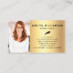 Präsentieren Sie Ihr bestes Selbst Ihren Kunden. Imitate Goldfolie, extravagante handgeschriebene Skripttypografie mit Federstift und vergoldetem Glitzer überlagern einen dramatischen, schwarzen Hintergrund. Auf der Rückseite, Ihr individuelles Foto auf der links Seite und moderne sans Serif Typografie über einem Imitat goldenen ombre Hintergrund auf der rechten Seite. Personalisieren Sie mit Ihrem vollständigen Namen und Geschäftsinformationen auf der Vorderseite. Füllen Sie auf der Rückseite das Foto Ihrer Wahl und Ihre Telefonnummern, Adresse, E-Mail, Website und andere Informationen aus. Macht eine schicke, berufliche und stilvolle Aussage, wo immer Sie hingehen. Fügen Sie einfach Ihr Foto hinzu, geben Sie Ihren Namen, Ihren Firmennamen und alle Ihre zusätzlichen Informationen in den Bereich "Personalisieren Sie diese Vorlage" ein, und Sie können diese Visitenkarte ganz einfach personalisieren. Bitte schicken Sie mir eine Nachricht mit Fragen oder Wünschen.