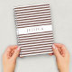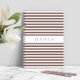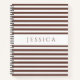 Spiralheft mit personalisiertem Namensdruck auf einem minimalistisch braunen und weißen Streifen.