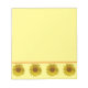 Gelbes Pad mit vier Sonnenblumenblüten unten, unterhalb einer horizontalen orangefarbenen Linie.