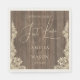 Nothing Fancy Just Love Rustic Wedding Napkins. Celebrate your special day with these rustic lace wedding paper napkins. Featuring a charming wooden background, delicate lace trim, and the heartwarming typography 'Nothing Fancy Just Love,' these napkins add a touch of vintage elegance to any reception. Personalize them with your names and wedding date for a truly unique keepsake. Perfect for rustic, barn, farm, garden or country-themed weddings, these napkins will be a cherished detail for your guests.