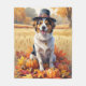 Ein Aquarellbild eines fröhlichen Hundes inmitten eines Haufen lebendiger Herbstlaub, umgeben von winzigen Kürbissen und verstreuten Eichhörnchen. Der Hund trägt einen kleinen Pilgerhut und strahlt vor Freude aus, um den Geist des Erntedanks zu erfassen. Im Hintergrund sorgen weiche Erntefelder und goldfarbene Bäume für eine friedliche Landschaft. Die sanfte Struktur und die warmen, gedämpften Herbsttöne verleihen der Szene ein gemütliches, nostalgisches Gefühl, das perfekt ist, um die Schönheit der Saison zu feiern.