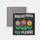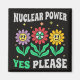 Cute smiling flowers with nuclear symbol and positive clean energy message. A cheerful retro inspired statement supporting nuclear power, sustainability and low emission electricity.
