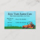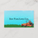 Himmelblau mit weißen Puffwolken und orangefarbenem Rasenmäher im Gras.