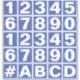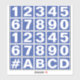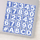 Zahlen von 0 bis 9. Einzelne Zahlen als Aufkleber auf einem Blatt. Blau und weiß.