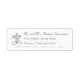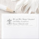 Right side of design features the image of a silver crucifix in center of joined wedding rings symbolizing Christ as center of the marriage. First initials of bride and groom are displayed on either side. Return address information is displayed in an elegant Nuptial font. A delicate flourish accents the design. Designed to coordinate with the Nuptial Grace Catholic Wedding Suite collection.