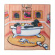 "Just 5 More Minutes" zeigt einen portugiesischen Wasserhund, der sich in der Badewanne entspannt, umgeben von monokulierten Handtüchern, speziellen Seifen und einer Wand aus Selbstporträts. Das ist ein Bild von vollkommener Selbstgefälligkeit. Tinten und farbige Bleistifte. c) 2014 Andie.