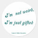 "Ich bin nicht seltsam, ich bin nur begabt", grün auf einem Blatt mit kleinen oder großen Aufklebern gedruckt.
