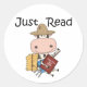 Just Read T-Shirts, hoodies, mugs, cards, stickers, buttons, magnets, mousepads, journals, keepsakes, and other reading theme apparel and ohrfeige that promote reading in a cute way! Cow with a straw hat and pitchfork rests against a hay bale with a book!