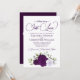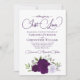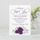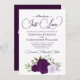Diese wunderschöne, schicke Hochzeitseinladung mit einer Reihe von handgemalten Aquarellfarben-Rose in lila, Lavendel- und Pflaumentönen, sowie Eukalyptus-Blätter mit Gartengrün. Die Überschrift ist in extravaganter Schrift geschrieben und lautet: Nichts Extravagant, Just Liebe! Auf der Rückseite befindet sich ein Detailbereich mit einem individuell anpassbaren QR-Code, in dem Sie Ihre Gäste auf eine Webseite für weitere Informationen und/oder zu UAWG weiterleiten können. Es ist mit einem Bouquet der gleichen Blume mit einem fließenden Satin-Bogen auf einem lila, marmorierten Hintergrund ausgestattet.