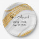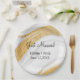 Schöne weiß-goldene Bands abstraktes Foto mit den Worten Just Married und den Namen des neuen Ehepaares und ihrem Hochzeitsdatum.