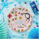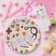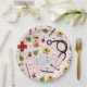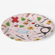 Teller der Creative Pflege Schule Graduation Party für Krankenschwestern und Diplom-Abschluss mit Gesundheitsvorräten und Blume auf rosa Hintergrund.