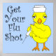 Lassen Sie Ihre Grippe in lockigen Text mit einer niedlichen, gelben Küken Krankenschwester, die eine hypodermische Nadel hält, erleben Sie ein lustiges Geschenkdesign mit einer Gesundheitsbotschaft.
