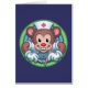 Glücklicher Retro-Vintager Cartoonkrankenschwesterbär, mit toony Handschuhen, konzentrischem Rahmen, Spritze in einer Hand und rektalem Thermometer in der anderen. Bunter Entwurf, auf T - Shirts, Hoodies, Karten, Geschenke.