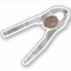 Eine stilisierte Abbildung eines Nussknackers aus Metall und einer Nuss, die zum Öffnen bereit ist.