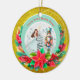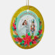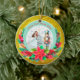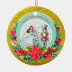 Description: Celebrate the magic of the holidays with this enchanting personalized Christmas ornament! Featuring a beautiful illustration of Clara from The Nutcracker ballet holding her beloved Nutcracker, alongside a festive Christmas tree and vibrant poinsettias, this ornament is a perfect keepsake. The front can be customized with a name (e.g., "Olivia as Clara") and the year, making it a truly unique memento. The reverse side carries a heartfelt "Merry Christmas! Wishing you a Happy and Healthy New Year. Love [Your Family Name]" message, surrounded by sparkling gold accents and a beautiful bokeh background. Crafted from a lovely teal and snowflake border, this ornament adds a touch of classic holiday charm to any tree. It's an ideal gift for ballet lovers, children, or families looking for a special way to commemorate the festive season.