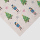 Ein Weihnachtspapier mit einer Illustration eines Nutcracker-Musters, Weihnachtsbäume und einige Sterne auf einem hellbraunen Hintergrund. Ideal, um Ihre Weihnachtsgeschenke zu dekorieren!