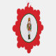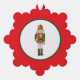 Red snowflake ornament with scalloped edges featuring a traditional nutcracker in red, green and gold, hanging on a christmas tree with warm lights