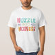 Die spielerische Botschaft "Nuzzle into Nicness" wird in einem lustigen, farbenprächtigen Regenbogen über das Shirt geschmückt. Jeder Buchstabe hat einen anderen Schriftart und eine andere Schriftgröße, was zu dem knebeligen Gesamtbild beiträgt.