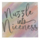 Das Design enthält den Text "Nuzzle into Niceness" in einem spielerischen, handgeschriebenen Schriftart, umgeben von bunten, skurrilen Wolkenformen und Sternen. Das Gesamtdesign vermittelt ein Gefühl von Wärme, Komfort und Positivität und lädt den Träger dazu ein, Freundlichkeit anzunehmen und Freude in einfachen Freuden zu finden.