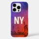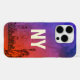 iPhone-Gehäuse mit zentrierter und reduzierter "NY"-Grafik, lebendigem Hintergrund und schwarzer Linie Skyline mit Freiheitsstatue.
