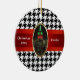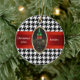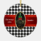 New York City Skyline: Emp St Gebäude Lit up in Red & Green, Black & White Hahnentrittmuster - Weihnachtsschmuck Die New Yorker City Skyline mit dem symbolträchtigen Emp St Gebäude, das zu Weihnachten in Rot und Grün erleuchtet ist, in einem goldenen Rahmen, vor einem Schwarz-Weiß-Hintergrund mit einem roten Band. 2012 ©NYCisMyMuse Alle Rechte vorbehalten