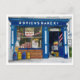 Ein Aquarell einer bunten, nostalgischen Bäckerei in Irland. Das weiße und blaue Gebäude kontrastiert zur bunten Reihe von Waren im Shopwindow und im Eingang.