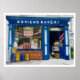 Eine Aquarellfarbe einer bunten, nostalgischen Bäckerei in Irland. Das weiße und blaue Gebäude steht im Kontrast zu den farbenfrohen Waren im Schaufenster und an der Tür.