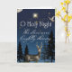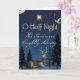 Ein schöner Hirsch steht inmitten eines dunkelblauen Nachthimmels voller Sterne. Eine Taube fliegt im Hintergrund, hervorgehoben durch das Licht des Vollmonds vor dem Hintergrund immergrüner Bäume. Das Gefühl der Karte ist O Heilige Nacht feiern die Geburt Christi.
