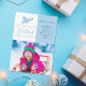 Eine wunderschöne blaue Taube sitzt über religiösen Weihnachtsbäumen. O komm alle, du treu, fröhlich und triumphierend. Eine Urlaubskarte voller Freude und Glück für Ihre Familie. Fügen Sie Ihr Kinderfoto neben der eleganten kursiven Typografie und ein zweites Familienfoto auf der Rückseite. Schöne Christliche Weihnachtskarten.