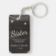 Oak Ridge Rustikales dunkelbraunes Barnholz, glänzende Mason-Jars und glänzendes String-Lights-Design mit winklenden Strängen von danglenden Lichtern und Gläsern auf einer tiefen, reichen Holzstruktur mit weißen Spitzenakzenten. Mit modernen Typografie-Script-Schriftart. Ein rustikales, elegantes Landhaus-Design - Personalisiertes Sister Heartfelt Zitat Keepake Schlüsselanhänger! ~ Karo mein Shop zu sehen, die gesamte Hochzeitssuite für dieses Design!