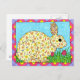 Dieser sanfte Hasen ist mit farbigen Markierungen in vielen verschiedenen Formen bedeckt, die an die in den Oaxacan-Tierschnitzereien gefärbten erinnern. Unter einem wolkenlosen, blauen Frühlingshimmel blinkt sie auf einem Klee. Die ganze Szene ist von einer detaillierten Grenze im mexikanischen Stil umgeben.