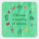 Gemälde von Obst und Gemüse auf einem gemischten grünen Hintergrund, mit der Aussage, Wählen Sie eine Vielzahl von Farben, auf quadratische Aufkleber gedruckt. Eine lustige Erinnerung, um eine Vielfalt von Farben zu essen.
