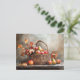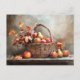 Ein wunderschöner Herbstkorb mit Äpfeln und Birnen, geschmückt mit lebhaften Herbstlauben, auf einer rustikalen Holzfläche angeordnet, schafft eine warme und einladende saisonale Komposition.