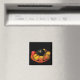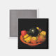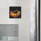 Dieser auffallende Magnet zeichnet sich durch eine üppige Schüssel aus, die mit Früchten überflutet. Ein Apfel, ein Avocado, Birnen und Bananen in einer orangefarbenen Schüssel mit schwarzem Hintergrund schaffen eine schöne künstlerische Komposition.