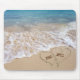 Herzensverhältnis auf Strand Sand mit Ozeansurfen. Benutzerdefinierte Namen können bearbeitet werden.