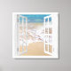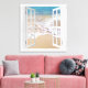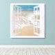Weißes offenes Fenster mit schlichten Vorhängen und Meerblick.