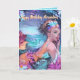 Aquarellmädchen in der Meeresgeburtskarte. Dieses Aquarell-Design hat viel Blau und Rosa. Der Hintergrund hat Ozeanwellen und einen bunten Himmel. Die Meerjungfrau trägt ihr Haar mit einem Kopfband aus Blume. Tauchen Sie ein in die Zauberei! Ideal für Meerjungfrauen. Helfen Sie jemandem mit dieser atemberaubenden Karte.