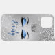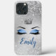 Ocean Blush Blue Glitzer Eyes Monogram Phone Case verfügt über eine Silver Queen's Crown und ein Paar Augenlider mit Ocean Blush Blue Glitzer Aushadow, Diamanté Effekt Liner mit langen schwarzen Lashes auf einem silbernen Glitzer Effekt Hintergrund. Personalisieren Sie mit dem Namen Ihrer Wahl in der Abstimmung Ocean Blush Blue. Entworfen von Jacqueline. Personalisiert von dir.