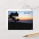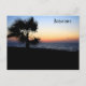 Diese hübsche Postkarte zeigt ein Foto einer Palme am Ozean bei Sonnenuntergang. Der Text in der oberen rechten Ecke ist für jeden tropischen Ort, den Sie gewollt haben, anpassbar, um den Anzug zu bestimmen!