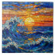 A tile with an illustration of a stained glass mosaic ocean waves and sunset illustration.