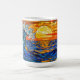 A coffee cup with an illustration of a stained glass mosaic ocean waves and sunset illustration.