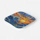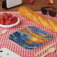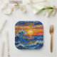 A paper plate with an illustration of a stained glass mosaic ocean waves and sunset illustration. These are perfect for a beach themed coastal birthday party.
