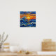 A poster with an illustration of a stained glass mosaic ocean waves and sunset illustration.
