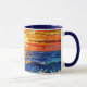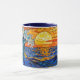 A coffee cup with an illustration of a stained glass mosaic ocean waves and sunset illustration.