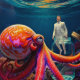 "Ocean's Silent Captive" - farbiges Octopus Portrait. In einer surrealen Ozeanwelt sieht ein Riesenktopus einen einsamen Mann, der in einem Glasgefäß gefangen ist. Diese eindrucksvolle Szene erforscht Themen der Gefangenschaft, die Weite der Natur und die fragile Barriere zwischen Freiheit und Gefangenschaft. Die lebhaften Farben und die komplexen Details laden zu tiefer Reflexion über die menschliche Verwundbarkeit unter den Wellen ein.