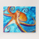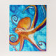 Lebhafte, farbenfrohe Orange- und lila Oktopuskreatur. Octopus Aquarellmalerei in kräftigen Farben mit einem Meereswelt-Thema. Meereskunst inspiriert. Design zum Thema Meer.